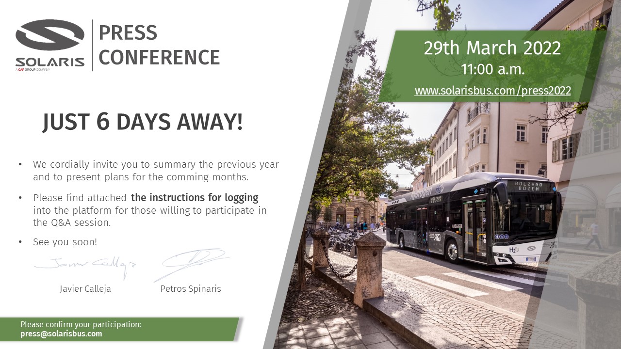 We are just 6 days away from the date of our company's annual press conference. The online broadcast will take place on Tuesday, March 29, 2022 at 11:00 am, at solarisbus.com/press2022. Please find attached the instructions for logging into the platform for those willing to participate in the Q&A session. See you soon!