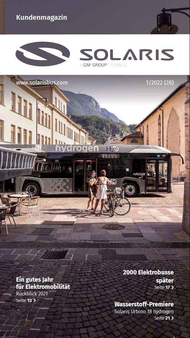 Die neuste Ausgabe des Kundenmagazins Solaris, das ununterbrochen seit über 20 Jahren herausgegeben wird, enthält viele spannende Inhalte – schließlich lassen wir in unseren Aktivitäten nicht nach. In den letzten Wochen sicherten wir uns den Auftrag über den 2000. Elektrobus. Viel Platz widmen wir der elektromobilen Revolution, die hier und jetzt stattfindet. Im Magazin stellen wir Ihnen auch erstmals unser neustes Busmodell, den wasserstoffbetriebenen 18-Meter-Bus, vor. Seine Premiere wird von der dritten Ausgabe der #SolarisTalks-Konferenz begleitet. Wir berichten auch über die ersten Auslieferungen des Urbino 9 LE electric, über Entwicklungsprojekte, an denen wir beteiligt sind, Produkte, die wir immer weiter perfektionieren und neue Aufträge. Viel Platz wurde auch der Wasserstofftechnologie gewidmet. Darüber hinaus befassen wir uns näher mit ESG-Themen und berichten über unser Bildungsprojekt #StadtMission. Das sind nur wenige der zahlreichen Themen, die wir Ihnen in der aktuellen Ausgabe des Magazins präsentieren.