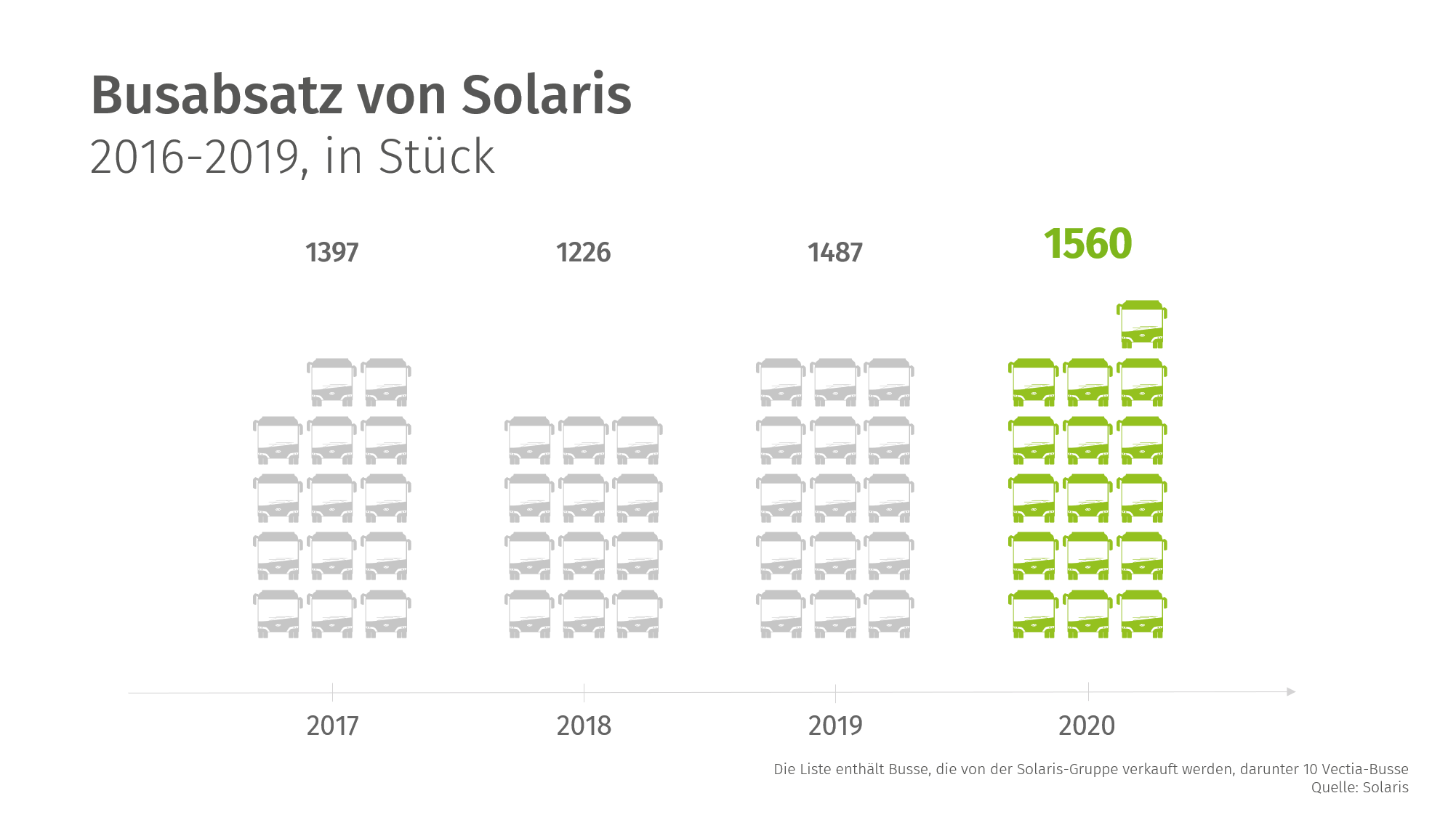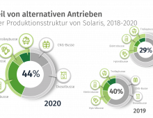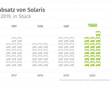 Ein höherer Anteil innovativer Batterie- und Hybridtechnologien am Absatz im Jahr 2020 wie auch verstärkte Aktivitäten des Unternehmens im Bereich After Sales und Ersatzteilvertrieb spiegelten sich in einer deutlichen Steigerung des Firmenumsatzes nieder. Im letzten Jahr betrug der Solaris-Umsatz über 725 Mio. EUR und war höher um 13,6% im Vergleich zum Vorjahr (638 Mio. EUR im Jahr 2019).