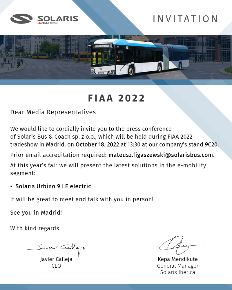 Solaris Bus & Coach sp. z o.o. cordially invites you to the press conference, which will be held during FIAA 2022 tradeshow in Madrid, on October 18, 2022 at 13:30 at our company's stand 9C20. See you in Madrid!
