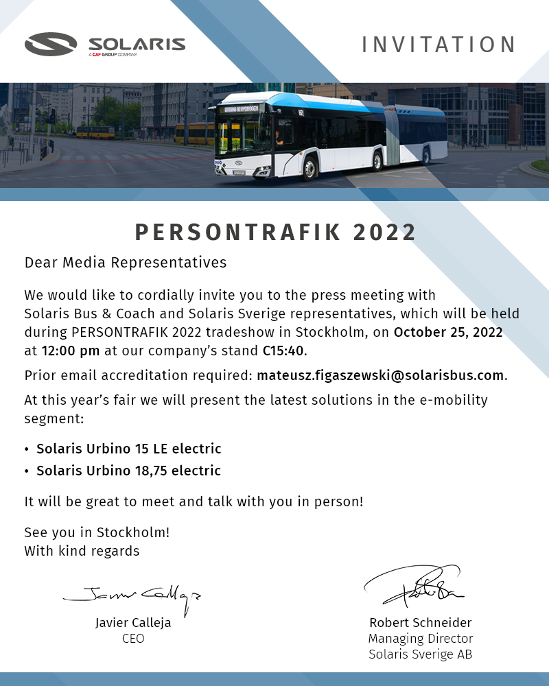 We would like to cordially invite you to the press meeting with Solaris Bus & Coach and Solaris Sverige representatives, which will be held during Persontrafik 2022 tradeshow in Stockholm, on October 25, 2022 at 12:00 p.m. at our company's stand C15:40. See you in Stockholm!