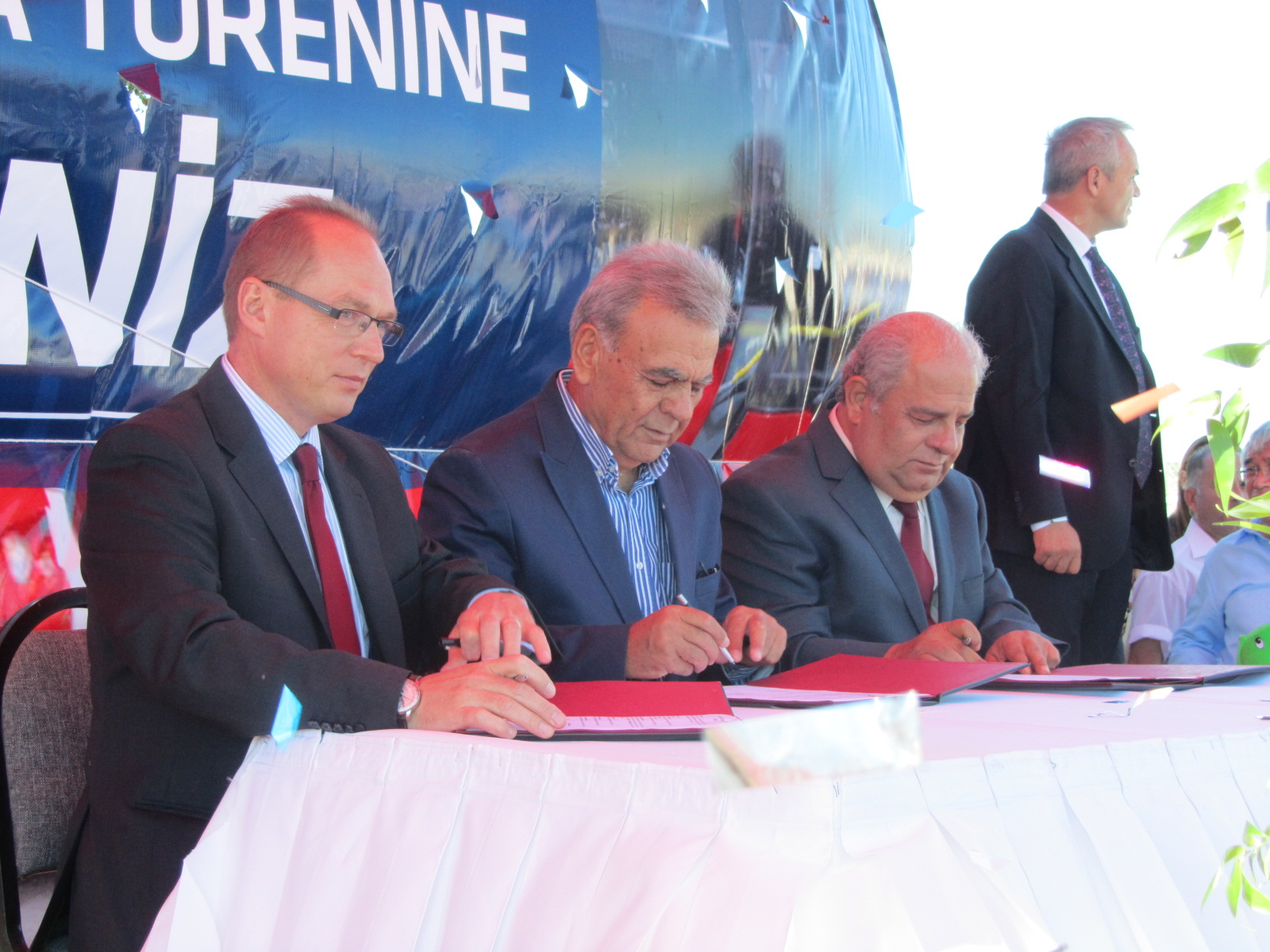 1. Dariusz Michalak (links) der Stellvertretender Vorstandsvorsitzender von Solaris und die Vorstandsmitglieder des Verkehrsunternehmens ESHOT unterschreiben den Vertrag über die Lieferung von 100 Gelenkbussen Urbino 18 nach Izmir.