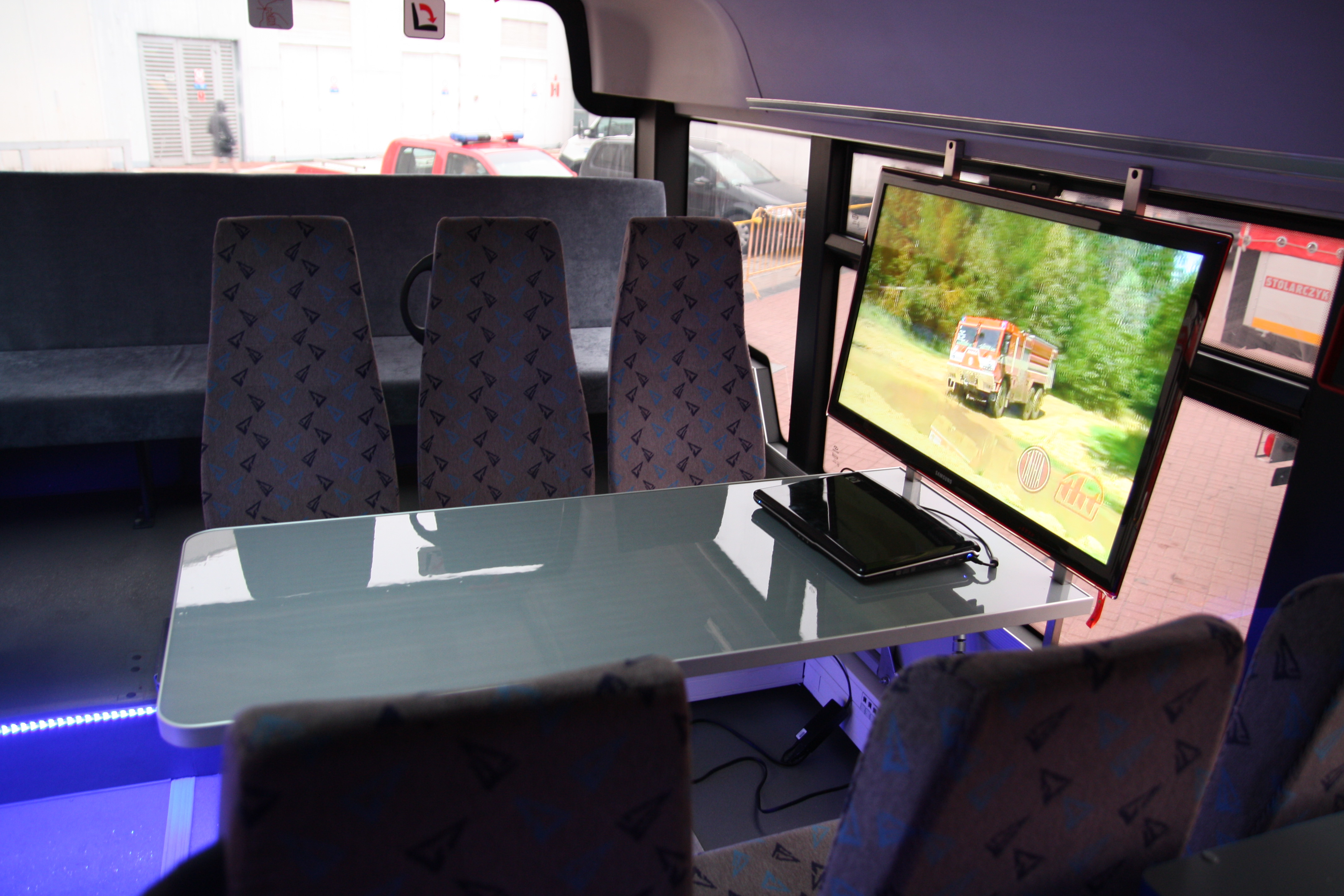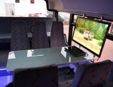 Krzysztof Musial, Solaris-Vertriebsdirektor Zentralpolen, erläutert die Ausstattung des Feuerwehr-InterUrbinos: "Im Bus findet sich ein Konferenztisch für Lagebesprechungen ebenso wie drei voll ausgestattete Arbeitsplätze für die Funkleitung, die über eine leistungsstarke Antenne bis zu 70 km weit kommunizieren kann. Batterien stellen eine autarke Stromversorgung über mehere Stunden hinweg sicher, darüber hinaus kann ein Generator genutzt werden."