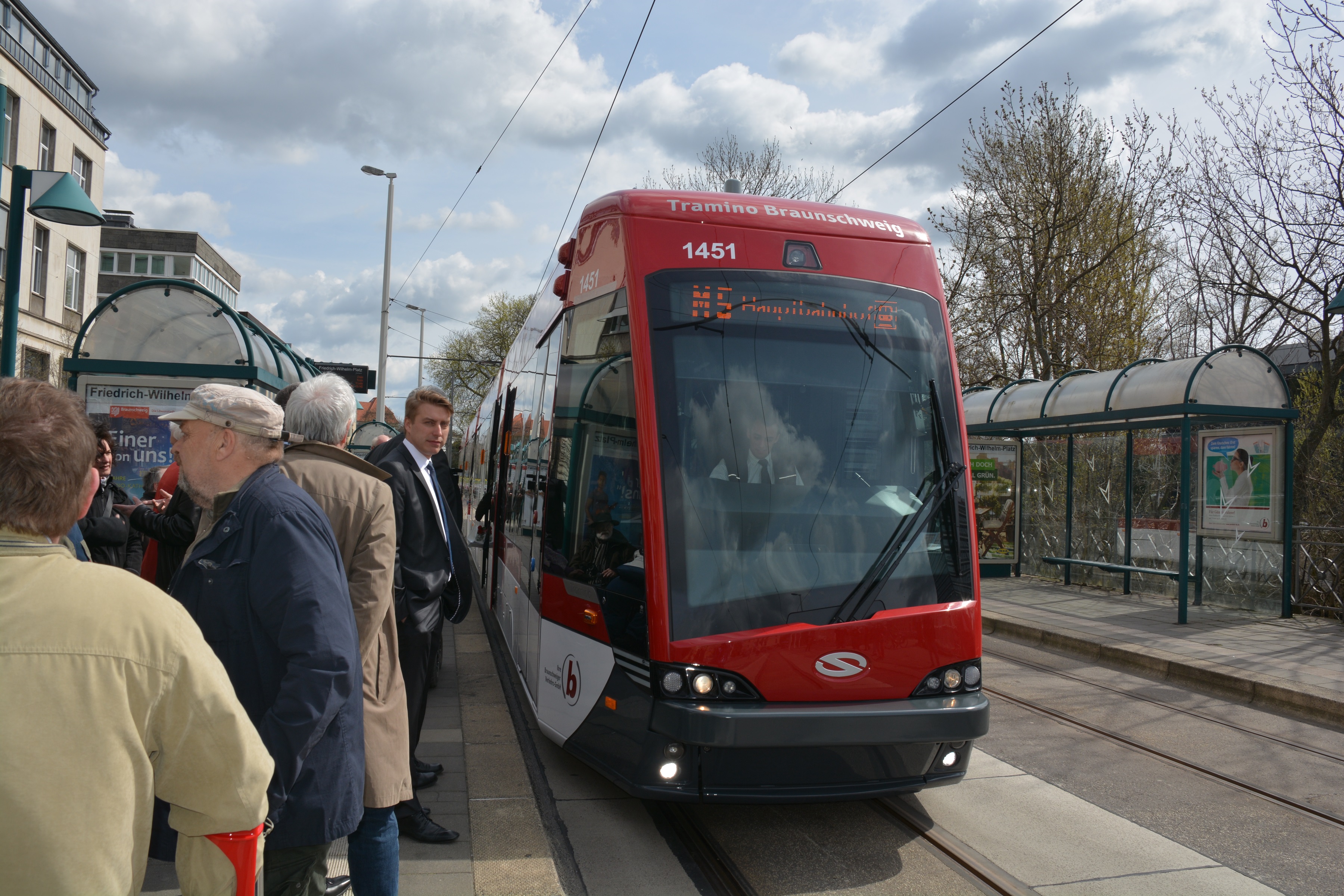 In der Stadt Braunschweig beginnt mit der Indienstnahme der 18 neuen Tramino, einer der größten Investitionen der Verkehrs-GmbH, eine neue Ära im dann nahezu barrierefreien modernen ÖPNV. Die Übergabe der ersten beiden Stadtbahnen an den Fahrdienst der Verkehrs-GmbH fand an der Haltestelle „Friedrich-Wilhelm-Platz“ auf dem Bruchtorwall statt. Ulrich Markurth, Oberbürgermeister der Stadt Braunschweig und Jörg Reincke, Geschäftsführer der Braunschweiger Verkehrs-GmbH, sowie der Bundestagsabgeordnete und Aufsichtsratsvorsitzende Carsten Müller übergaben den ersten und zweiten Tramino an die Fahrern der Linien M3 und M5, die mit ihren Fahrgästen aus Straßenbahnen der Baureihe 1977 in die modernen, zu 100% niederflurigen Bahnen umstiegen.