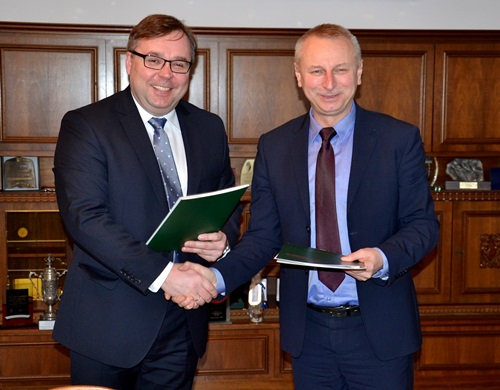 Im Bild (von links): Paweł Kaczalski, Solaris-Vorstandsmitglied und Ryszard Brejza, Oberbürgermeister von Inowrocław, während der Vertragsunterschrift.