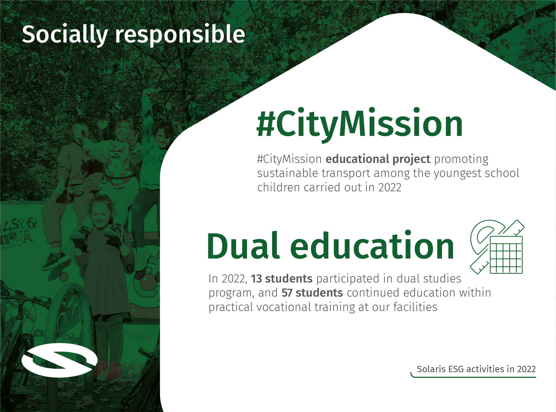 Care for the professional development of employees is considered another key factor contributing to the Company’s growth. The Report describes how Solaris supports the people whose day-to-day efforts help the Company achieve its business objectives by continuously improving their professional expertise. In the area of social engagement in 2022, the educational campaign called CityMission by Solaris was focused on educating the youngest generations in environmental awareness and encouraging the use of public transport. The project was targeted at primary school students in grades 1 through 3 and offered participation in a creative contest, educational workshops and an urban game.