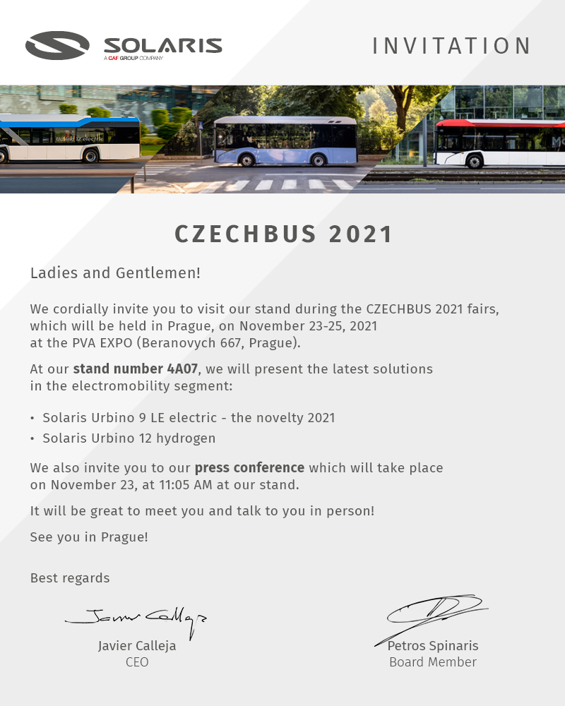 Ladies and Gentlemen! We cordially invite you to visit our stand during the CZECHBUS 2021 fairs, which will be held in Prague, on November 23-25, 2021 at the PVA EXPO (Beranovych 667, Prague).