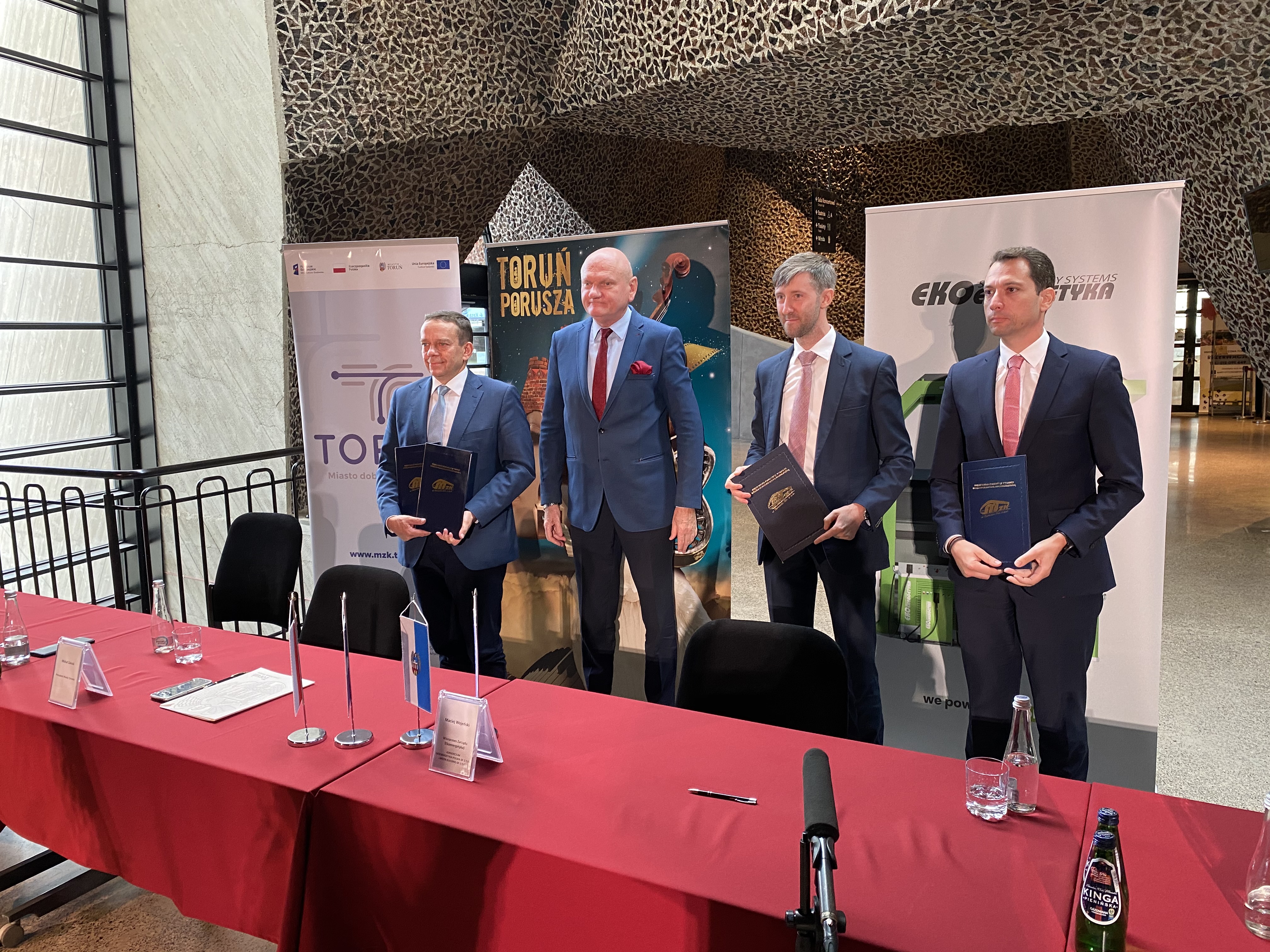 Na zdjęciu (od lewej): Zbigniew Wyszogrodzki (Prezes MZK Toruń), Michał Zaleski (Prezydent Torunia), Maciej Wojeński (Wiceprezes Zarządu Ekoenergetyka - Polska S.A.), Petros Spinaris (Członek Zarządu Solaris Bus & Coach sp. z o.o. odpowiedzialny za obszar Sprzedaży, Marketingu i Customer Service).