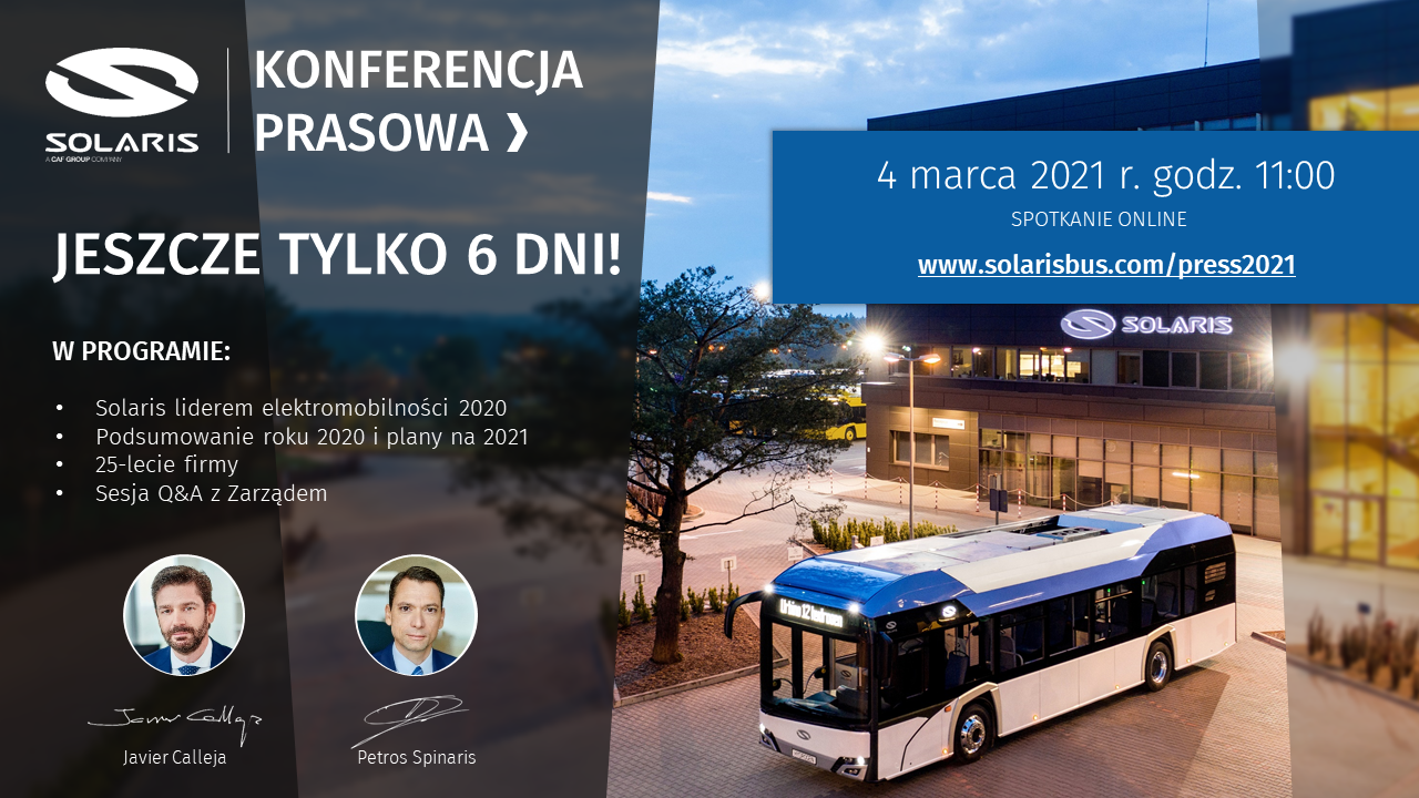 Solaris Bus & Coach sp. z o.o. to czołowy europejski producent autobusów miejskich i podmiejskich. Swoją działalność koncentruje na rozwoju pojazdów nisko- i zeroemisyjnych – elektrycznych, wodorowych i trolejbusów. Pojazdy marki, od idei, poprzez fazę projektową i wykonawczą, powstają w Polsce. Cała działalność producenta jest spójna z misją marki zawartą w haśle: „Zmieniamy oblicze transportu publicznego”. Solaris dostarczył już dziesiątki tysięcy pojazdów operatorom komunikacji miejskiej niemal w całej Europie, wspierając ich w transformacji transportu na bardziej ekologiczny i zrównoważony. Pojazdy firmy były wielokrotnie nagradzane za jakość i innowacyjność, m.in. dwukrotnie otrzymując prestiżowy tytuł „Bus of The Year” – dla autobusu elektrycznego Urbino 12 electric na rok 2017 i dla autobusu wodorowego Urbino 18 hydrogen na rok 2025. Producent jest także aktywnym uczestnikiem europejskich działań związanych ze zrównoważonym rozwojem miast, dzieląc się swoim doświadczeniem i ekspercką wiedzą związaną z transformacją transportu na bezemisyjny. Solaris należy do hiszpańskiej Grupy CAF (Construcciones y Auxiliar de Ferrocarriles) S.A.