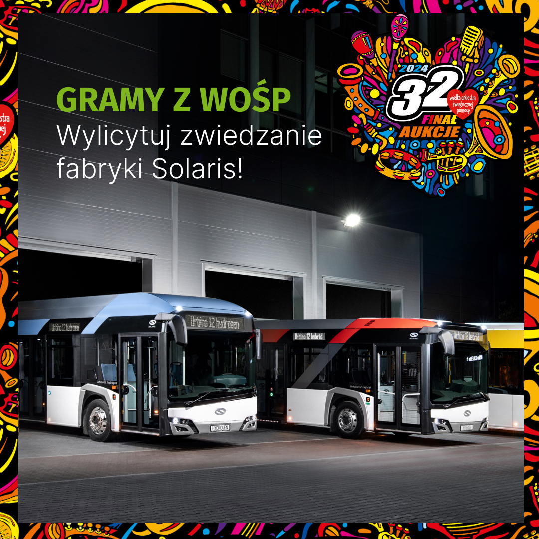 Solaris Bus & Coach wspiera 32. Finał Wielkiej Orkiestry Świątecznej Pomocy, wystawiając na licytację możliwość zwiedzania fabryki autobusów i głównej siedziby firmy w Bolechowie pod Poznaniem. Licytacja trwa do 7 lutego 2024 roku.