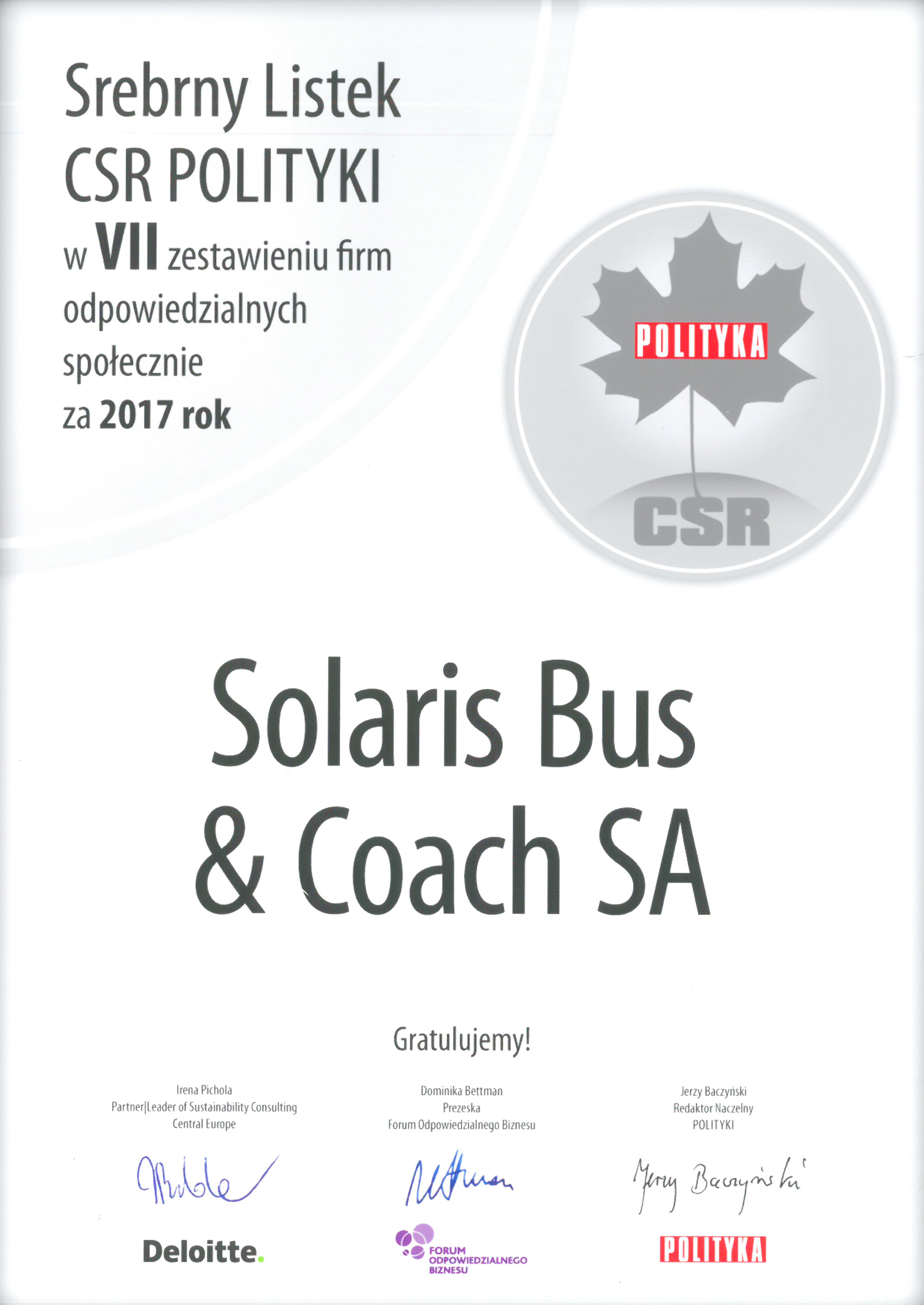 Działania realizowane przez Solaris Bus & Coach S.A. w obszarze społecznej odpowiedzialności zostały wyróżnione przez tygodnik „Polityka”, firmę doradczą Deloitte oraz Forum Odpowiedzialnego Biznesu. Kapituła przyznała Listki CSR Polityki, będące wynikiem przeglądu działań podejmowanych przez przedsiębiorstwa, już po raz siódmy. Wyróżnienia otrzymało 66 firm działających w całej Polsce.