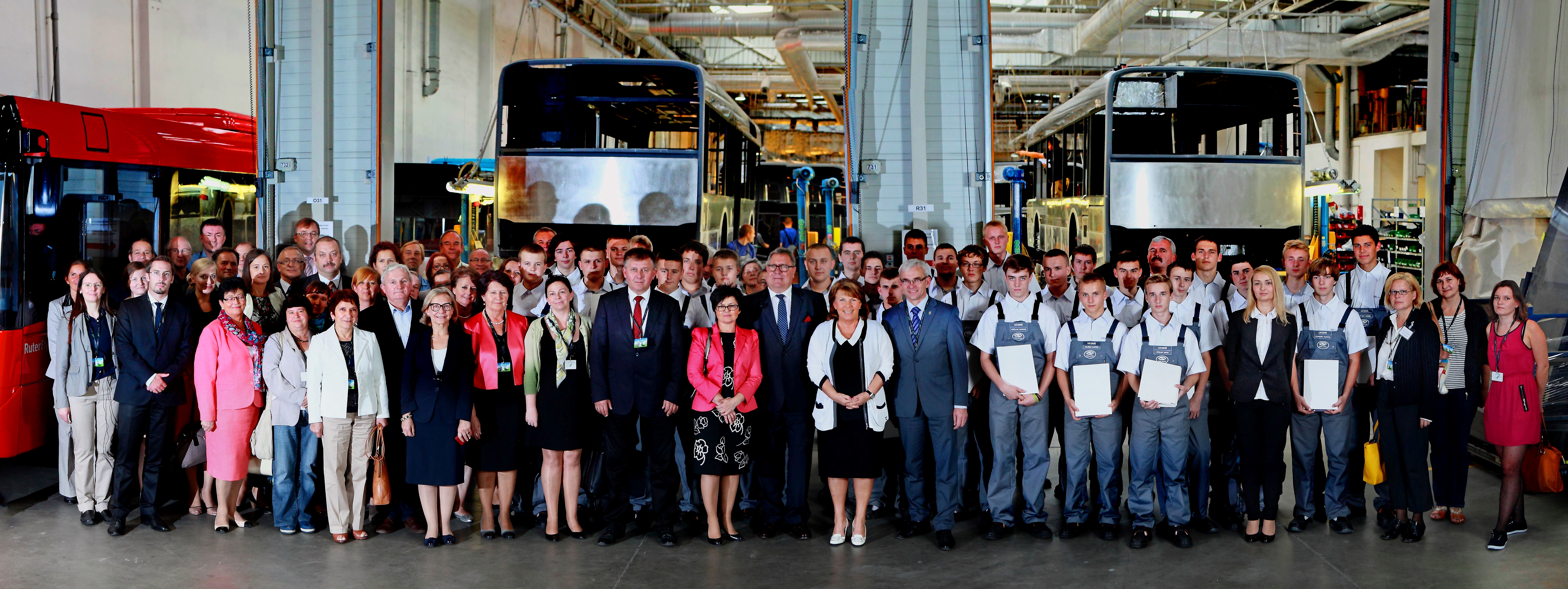 1. Solange Olszewska, Prezes Zarządu Solaris Bus & Coach S.A. oraz Jan Grabkowski, Starosta Poznański wręczają umowy o pracę absolwentom poprzedniej edycji programu Klasy Patronackiej Solarisa.