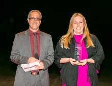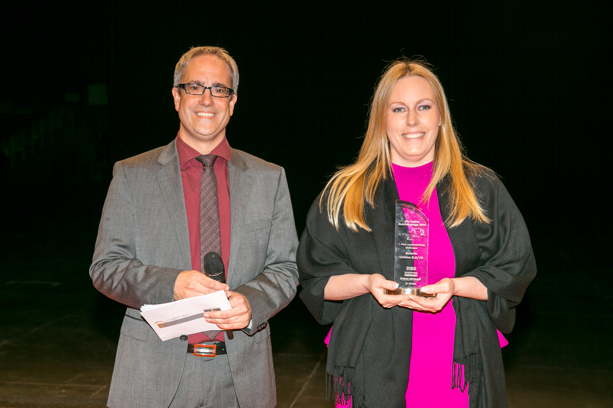 Zdjęcie: Małgorzata Olszewska, Prezes Zarządu Solaris Deutschland GmbH, odbiera wyróżnienie z rąk Thomasa Rosenberga, Redaktora Naczelnego magazynu lastauto omnibus, fot. Thomas Küppers.